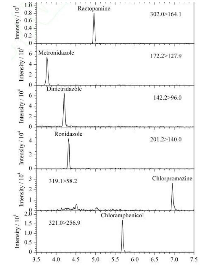 App ID: FLM-T240003 (甲硝唑氯霉素氯丙嗪克侖特羅沙丁胺醇等) 色譜柱:Titank C18 3u 100*2.1mm 貨號:FMD-5559-BONU 流動相:A 乙腈 B 0.1%甲酸 流速:0.3ml/min 進樣體積:5 μL 柱溫:40℃