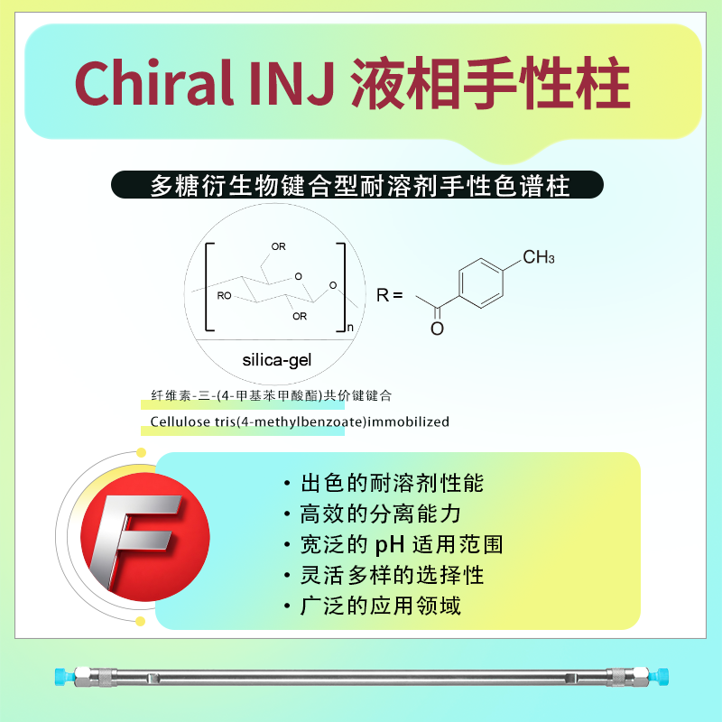 Chiral INJ 鍵合型耐溶劑手性柱的固定相為纖維素-三-(4-甲基苯甲酸酯)共價鍵鍵合(Cellulose tris(4-methylbenzoate)immobilized)。這種設計使得該手性柱具有出色的手性識別能力和耐溶劑性,能夠在廣泛的溶解條件下使用,包括各種互溶的溶劑作為流動相、溶解樣品以及手性柱再生。